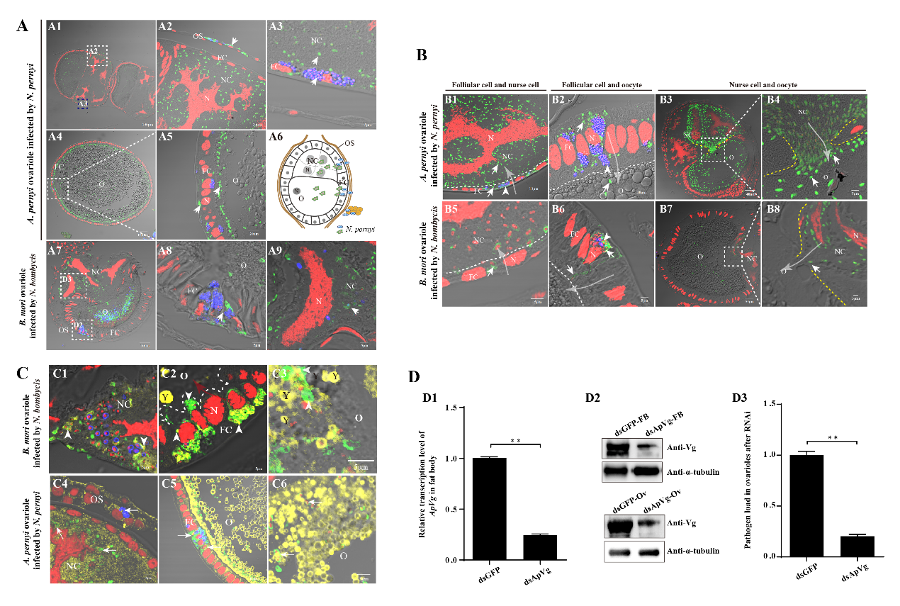 尊龙凯时微孢子虫研究团利用N. pernyi感染柞蚕,N. bombycis分别感染家蚕、棉铃虫和斜纹夜蛾,比较分析了微孢子虫经卵巢垂直传播过程和机制的保守性及差异。研究发现,两种微孢子虫侵入宿主卵母细胞的路径高度相似,均依次感染卵鞘细胞、滤泡细胞、滋养细胞,最终侵入卵母细胞。然而,两种病原的垂直传播过程存在明显差异:N. bombycis仅在卵黄发生期(卵巢管暴露于血淋巴)才能侵染卵巢管,而N. pernyi则在柞蚕蛹滞育期即可侵染卵巢管。此外,N. bombycis对卵巢管各细胞的感染率较低,且在卵母细胞和滋养细胞中均能产生成熟孢子;而N. pernyi的感染率较高,且在卵巢管各细胞中主要处于增殖状态。为深入揭示微孢子虫垂直传播的分子机制,研究团队对家蚕和柞蚕的卵黄原蛋白(vitellogenin, Vg)进行RNAi分析,发现卵巢管中的病原载量显著降低,揭示了Vg在微孢子虫垂直传播中的保守性和关键性作用。